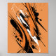 Ein beeindruckendes abstraktes Kunstwerk mit fett schwarz, weiß und orange glänzt auf einem soliden orangefarbenen Hintergrund. Das Design zeichnet sich durch dynamische Pinselstriche, Spritzer und energetische Wirbel aus und schafft ein modernes urbanes Straßenkunstbild voller Bewegung und Ausdruckskraft.