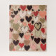 Eine Vielzahl von herzlichen Formen, die sich in Größe und Farbe unterscheiden, sind über einen beigefarbenen Hintergrund verteilt, wodurch ein mit Wärme und Charme erfülltes Muster entsteht. Die Herzen sind in Rot-, Rosa-, Weiß- und Grüntönen dargestellt und verleihen dem Bild ein spielerisches und romantisches Ambiente.