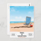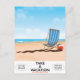 Nehmen Sie einen Urlaub "Sein schneller mit der Bahn" Vintages Strandurlaub-Poster eines Vintag gestreiften Liegestuhls und Beachball auf einem heißen Sandstrand am Ozean.