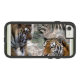 Schöne digitale Kunst mit zwei Tigern mit 3D-Effekt, die scheinbar aus dem Bilderrahmen springen. Hintergrund mit Giraffe und Zebra. Eine wunderbare wilde Tierkunst ist eine wunderbare Geschenkidee für Naturliebhaber.