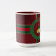 Goldene Glocken in der Mitte eines heiligen Kranzes aus dunklen Blätter und roten Edelsteinen für Beeren, durchkreuzt von roten und grünen, mit goldenen Sternen umsäumten Bändern. Wie ein Weihnachtsgeschenk in dunkelrot verpackt und mit hellen Streifen gebunden.