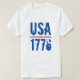 USA und 1776 in einem einzigartigen Schriftart ist blau auf diesem unisex T - Shirt mit roten und blauen Streifen und einem goldenen Stern hervorgehoben. Wählen Sie Ihre T - Shirt Farbe und Größe aus den verfügbaren.