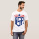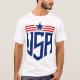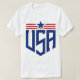 Dieses Bild stellt ein elegantes und modernes "USA" Emblem dar, das als patriotisches Schild stilisiert wurde. Die Buchstaben "USA" werden in einem kühnen, dunkelblauen, eckigen Schriftart gerendert, der die Basis des Schildes bildet. Über den "USA" erstreckt sich eine rote Bar mit drei horizontalen Streifen, die von einem prominenten dunkelblauen Stern überragt wird und Elemente der amerikanischen Flagge widerspiegelt.