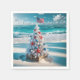 Ein weißer Weihnachtsbaum mit blauen und roten Dekorationen steht auf einem Sandstrand, der von einer amerikanischen Flagge überragt wird