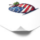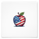 Eine Abbildung eines Apfels mit dem Fahnenmuster der Vereinigten Staaten in voller Farbe. Auf der links Seite des Apfels stehen weiße Sterne auf blauem Hintergrund, auf der rechten Seite sind rote und weiße Streifen zu sehen. Der Apfel selbst sollte eine glatte, kühne Kontur haben, ohne Schatten oder Gradienten, und Stamm und Blatt sollten ein natürliches Grün sein. Die Farben sollten lebendig und klar sein, mit einem einfachen und klaren Design