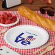 Personalisierte Party Papier Teller haben einen Platz für einen Namen für sich selbst oder einen besonderen Ehrengast. Das Design zeigt das Wort LIEBE in blauen Buchstaben mit einer herzförmigen Fahne der USA für das O in Liebe. Für besondere Anlass, wie 4. Juli oder Unabhängigkeitstag. Ideal für ein häusliches Party für Ihren Patrioten. Spaß für Wiedersehen aus den USA, oder Geburtstage.
