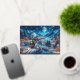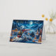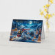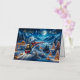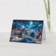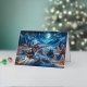 Une belle aquarelle d'une scène hivernale nocturne avec une locomotive à vapeur vintage arrivant à une station ornée de lumières festives de Noël. La neige recouvre le sol et les toits, et la toile de fond présente des montagnes imposantes sous un ciel étoilé avec une pleine lune. La lumière chaleureuse des phares du train et les lumières scintillantes créent une atmosphère de vacances accueillante et confortable, évoquant des sentiments de nostalgie et de célébration associés à la période de Noël.