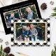 Encadrée dans une véritable feuille d'or et plaid, cette carte de Noël festive "Happiest Holidays" présente un design de vacances photo paysagère avec bordure en feuille d'or et accent du coeur, un motif à chèques-buffles noir et blanc tendance, et un texte noir simple et élégant qui peut être entièrement personnalisé sur le devant et le dos de la carte. L'arrière dispose d'un espace pour inclure deux photos de famille supplémentaires. Crédit photo : Sunbeam Photography www.facebook.com/SunbeamPhotography