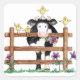 Une vache qui regarde au-dessus des autocollants de clôture.