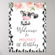 Pink Floral Cow Imprimer Anniversaire Fête Affiche de bienvenue Vache mignonne thème anniversaire fête signe de bienvenue. L'affiche de la fête d'anniversaire de cette fille comprend une jolie vache blanche et noire, un motif à l'aquarelle et de jolis roses floraux roses en haut. Bonne façon d'accueillir les invités à la fête d'anniversaire à thème de la vache de votre petite fille.