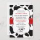Vache mignonne Imprimer Rouge Black Invitation avec un ruban rouge. Image mignonne d'une vache noire et blanche. Un design neutre pour les filles ou les garçons.