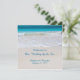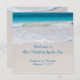 Voeux côtiers, bienvenue à notre mariage au bord de la mer. Customisez le texte imprimé à l'avant de ce programme de mariage décontracté à la plage. Jolie eau tropicale de l'océan et sable de plage lisse est l'image arrière - plan des deux côtés de cet article avec du texte bleu, script.