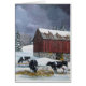 C'est ma peinture acrylique originale de quelques vaches laitières du Holstein dans une basse-cour neigeuse ; une vieille grange en bois rouge est vue derrière elles et dans la porte ouverte une autre vache est se situer vu dans la paille.