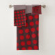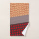 Cet ensemble de serviettes présente un design moderne du milieu du siècle avec des lignes ondulées orange sur un arrière - plan or, des cercles rouges sur un arrière - plan marron et un arrière - plan gris. Si vous voulez le même design avec des couleurs différentes, envoyez-moi un message.