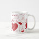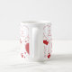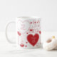 Eine Tasse, die mit einem Valentinmuster von zwei Namen, rot auf weiß, entworfen wurde. Passen Sie die Tasse unter anderem mit Ihren Herznamen, der Hintergrundfarbe an.