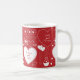 Eine Tasse, die mit einem Valentinmuster von zwei Namen, weiß auf rot, entworfen wurde. Passen Sie die Tasse unter anderem mit Ihren Herznamen, der Hintergrundfarbe an.