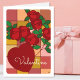 Für Ihr Valentine, eine wunderschöne Buntglasillustrierung eines roten Herzens, rote Rosen auf einem Hintergrund von bunten Quadraten. Das Wort Valentine befindet sich in einem cremefarbenen Script-Schriftart auf der Vorderseite. Innen: Leere
