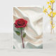 Eine rote Rose liegt anmutig auf einem glatten, weißen Satin-Stoff mit Perlsträngen. Der Insider-Text kann geändert werden.
