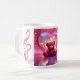 Valentines Tasse Ein zauberhafter, roter Teddybär, der vor einer leuchtenden, herzförmigen Kulisse sitzt. Die lebhaften Rosa- und Rottöne, gepaart mit strahlenden Lichtreflektionen und schwebenden Herzen, schaffen eine traumhafte und romantische Atmosphäre. Perfekt für Valentinstag Themen, Liebe inspiriert Projekte und Geschenksammlung.