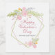 Schönes rosa Blumenweinlabel Happy Valentine's Day Party für einen eleganten Brunch oder ein Damenessen Mittag mit Freunden. Schöner Rahmen aus Hexagon mit Frühlingsblumen aus rosa Hibiskus und gelber Daffodil mit grünem botanischem Spray.