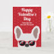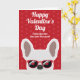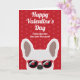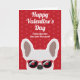 Franzosen, schicken Sie dem Menschen eine Valentinenkarte nur von Ihnen. Das Design zeigt einen niedlichen, weißen, französischen Bulldoggen, der eine rote Sonnenbrille auf einem roten Hintergrund mit einem subtilen Herzmuster trägt. Die Formulierung auf der Vorderseite lautet "Happy Valentine's Day from the one you most", aber kann geändert werden. Innen steht "Ich pawsitiv Liebe Sie", aber auch kann geändert werden. Dieses Design ist auch mit verschiedenen bunten französischen Bullhunden erhältlich.