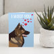 Die Hunde-Valentinstag-Karte mit einem blauen Hintergrund, der in jede Farbe verändert werden kann, einem flauschigen deutschen Hirten, den Herzen der roten Liebe und den humorvollen Worten "I WOOF YOU".