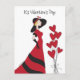 Mädchen in einem roten Kleid, schwarzer Hut und lange schwarze Handschuhe und sieben Herz Ballons schweben von ihr.