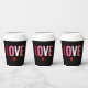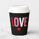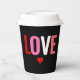 Genießen Sie Ihr warmes Getränk mit diesen Valentinstag Red Heart Liebe Coffee Paper Cups. Die Becher sind modern und einfach mit dem Wort "LIEBE" in großen, fett gedruckten Blockbuchstaben in Rot, Rosa, Weiß und Korallen um einen individuell anpassbaren schwarzen Hintergrund. Ein kleines rotes Herz liegt unter dem Text. Verfügbar mit Deckel oder ohne Deckel.