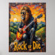 Dieses lebendige Kunstwerk besticht durch einen coolen Löwen, eine sportliche Sonnenbrille und eine Lederjacke. Sie spielen intensiv eine E-Gitarre, während sie auf einem Felsvorsprung sitzen. Die Szene ist Set in einem üppigen Tal von sanften grünen Hügeln, mit immergrünen Bäumen übersät, alle unter einem dramatischen, feurigen Sonnenuntergang Himmel. Die dicken, strukturierten Pinselstriche verleihen der Malerei eine dynamische und ausdrucksstarke Qualität und vermitteln den Geist "Rock or Die".