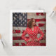 Das Bild zeigt eine selbstbewusste Frau stehend. Eine Kamala Harris sieht vor einer großen amerikanischen Fahne ähnlich aus. Sie ist in einem auffallenden roten Polka Dot Blazer gekleidet, der ihr Aussehen eine lebendige und stilvolle Touch verleiht. Ihre Hände werden auf ihre Hüften gelegt, und sie blickt mit einem komponierten und entschlossenen Ausdruck zur Seite. Die Fahne im Hintergrund mit ihren US Flagge bildet einen patriotischen Hintergrund und betont Themen wie Nationalstolz und Führungsstärke. Die Gesamtkomposition des Bildes vermittelt Stärke, Zuversicht und einen Sinn für Zweck.