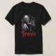 Count Dracula in a menacing pose against a black background. The vampire is depicted with sharp features, pointed ears, and prominent fangs, his hands outstretched as if reaching towards the viewer. The artwork is primarily black and white, with the name "Dracula" rendered in a stylized red font at the bottom, complete with dripping blood effect. Perfect gif for horror lovers.