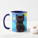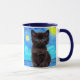 Kaffeekatze in Van Gogh's Gemälde Starry Night mit einer schwarzen Tasse! Dieses blaue mit Augen Kätzchen blickt bewundernswert von blauen Wirbel und einem hellgelben Mond. Ein fantastisches Geschenk für Katzenliebhaber und holländische Kunstsammler!