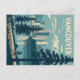 eine Retro-Postkarte von Vancouver, Kanada. Inklusive der Skyline mit hochgläsernen Gebäude, die von den North Shore Mountains gestützt werden. Fügen Sie im Vordergrund die immergrünen Bäume des Stanley Parks und einen Radler auf dem Meereswandweg hinzu. Inklusive Reflexionen im Wasser des Burrard Inlet. Verwenden Sie aquamarine, navy- und waldgrüne Farbtöne mit knackigen Vektoren und geometrischer Stilisierung. Erleben Sie das saubere, moderne Ambiente der Stadt mit Vintagem Flair."