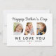 Schaffen Sie ein stilvolles und unvergessliches Geschenk für den Vater in diesem Vatertag! Diese individuell gestaltete, flache Grußkarte enthält eine Collage von drei Lieblingsbildern der Familie, die als moderne und kühn serifenlose Schrift entworfen wurden. Personalisieren Sie den benutzerdefinierten Text mit den Namen der Kinder. Enthält einen roten Herzakzent.
