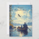 Hübsches Aquarellbild eines Vaters und Sohnes, der für einen Angeltag in einem Ruderboot ausgeht. Sie liegen auf einem schönen See , klarer blauer Himmel und Adler fliegen über.
