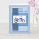 Eine tolle Karte zum Vatertag. Ein blaues Motorrad auf abstraktem, blauen Hintergrund. Auf der Vorderseite steht "Der Tag des glücklichen Vaters". Eine tolle Karte für einen Motorradfreund. Die Texturen auf der Vorderseite dieser Karte sind gedruckt.