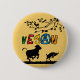 Veganes Abzeichen mit niedlicher, glücklicher Kuhziege und Hahn-Silhouetten, die für Freude springen.