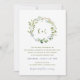 Aquarelle Verdure Wreath Wedding Invitations (Dusty Blue) : Ce faire-part de mariage d'aquarelle présente vos initiales en haut entourées d'un eucalyptus bleu vert et poussiéreux et d'une couronne d'haleine pour bébé. L'arrière a un faux look de planches de bois rustique. Ne veux-tu pas de bleu poussiéreux ? Vous pouvez modifier la couleur de votre texte dans l'éditeur. Changez la teinte de la verdure et du fond en changeant la couleur de votre arrière - plan !