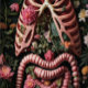 Eine auffallende Verschmelzung von Skelettbändern, verwoben mit verwurzelten Wurzeln und Weinreben, symbolisiert das Leben von innen heraus. Dunkle Blumen tauchen aus den leeren Körperräumen auf und vermischen Tod und Wiedergeburt in einem unheimlichen, aber fesselnden Kontrast. Die Palette ist reich an Fingern, tiefen Grüntönen und Holzkohle, die das Wesen der Natur wiederbeleben und den Körper wiedergewinnen