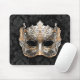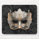 A highly detailed Venetian mask features elegant white and gold ornate designs with pearls and gemstones, set against a dark, damask-patterned background. The intricate craftsmanship and luxurious elements exude a sense of mystery and sophistication. Venetian Mask