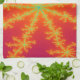 Dieses phantastische Küchentuch weist ein Fraktal auf, das an ein Gewitter auf der Venus erinnert. Es hat einen hellorangen Hintergrund mit hellgelben Linien, die aus der Mitte kommen und wie Blitzschrauben aussehen. In der Mitte jedes Blitzes befindet sich eine blaue Linie, die mich an eine Vene erinnert, die zum Titel Venous Thunderstorm führt.