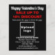 Bonne Saint Valentin ! Un beau jour férié pour célébrer ce mois de février et faire de la publicité pour votre entreprise ou pour promouvoir votre marque. Circulaire personnalisable avec vente Valentine, votre nom d'entreprise et d'autres informations de votre entreprise, un matériel marketing que vous pouvez utiliser pour attirer plus de clients. Customisez-le et distribuez-le afin d'attirer plus de clients pour acheter vos produits ou clients pour aimer vos services. Les couleurs design sont des textes rouges et blancs sur arrière - plan noir. Pour customiser ce prospectus, indiquez le pourcentage de remise que vous proposerez et les dates de vente. Téléchargez également votre logo d'entreprise, tapez votre nom d'entreprise, votre adresse, votre numéro de téléphone, votre adresse électronique et votre site Web ou votre page de médias sociaux d'affaires. Veuillez vérifier l'apparence sur les côtés avant et arrière après avoir tapé des textes et chargé le logo. Si l'apparence vous plaît, vous pouvez passer votre commande maintenant. Si vous avez besoin de redimensionner et déplacer les textes et le logo pour s'adapter à ce flyer ou à la taille que vous choisirez, veuillez modifier l'outil de conception. Vous pouvez également modifier la couleur arrière - plan, la couleur de police et le style de police dans l'outil de conception. Bonne Saint Valentin ! Je vous souhaite plus de ventes ce jour férié.