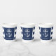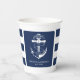Stripte nautische blaue und weiße Hochzeitspapiertassen. Ideal für eine Hochzeit der Marine (Militär) oder des Seehauses. Das Design enthält einen Anker, der in einem Banner mit dem Text "In Liebe verankert" eingewickelt ist. Personalisieren Sie es mit Ihren Hochzeitsdetails.
