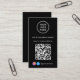 Moderne und berufliche schwarze Visitenkarte für Ihr Unternehmen mit QR-Code für Kunden, um eine Liste Ihrer Produkte, Dienstleistungen, Preise oder andere Informationen zu suchen. Laden Sie Ihr Logo und Ihren QR-Code hoch und fügen Sie Ihren Firmennamen, Ihre Website, Ihren Slogan, Ihre Telefonnummer, Ihre Straßenanschrift usw. in einer einfachen weißen Typografie hinzu. Fügen Sie Ihre instagram und facebook Benutzer-ID für Kunden zu folgen Sie auf sozialen Medien.