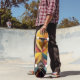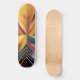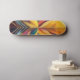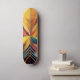 In der Mitte konvergiert eine lebhafte Reihe gewagter geometrischer Formen, die eine symmetrische und farbenfrohe Zusammensetzung bilden. Das Stück verwendet eine Vielzahl von Farbtönen, von warmen Gelbtönen und Orangen bis hin zu cooler Blues und Purpur.