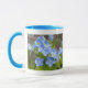 Tasse mit reizendem nahem hohem Foto von hellblauem vergessen mich nicht Blumen auf beiden Seiten