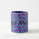 Lila Hintergrund mit blauen Vergissmeinnicht-Blumen und Titel "vergessen mich nicht" auf einer Kaffee-Tasse mit blauem Griff