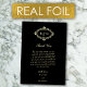 Un beau mariage en feuille d'or véritable avec des initiales monogrammées dans une couronne élégante traditionnelle. Un superbe design mariage noir et or avec une typographie minimaliste classe. La typographie de script traditionnelle et la couronne damasée créent un design élégant intemporel de feuille d'or mariage carte de remerciements.