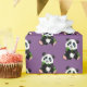 Geschenkverpackungspapier gezeigt in einer lila Hintergrundfarbe mit einem niedlichen Pandabärndruck.