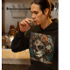 une femme avec un visage magnifiquement peint et des fleurs dans ses cheveux prêts pour les dias de los muertos en orange et turquoise